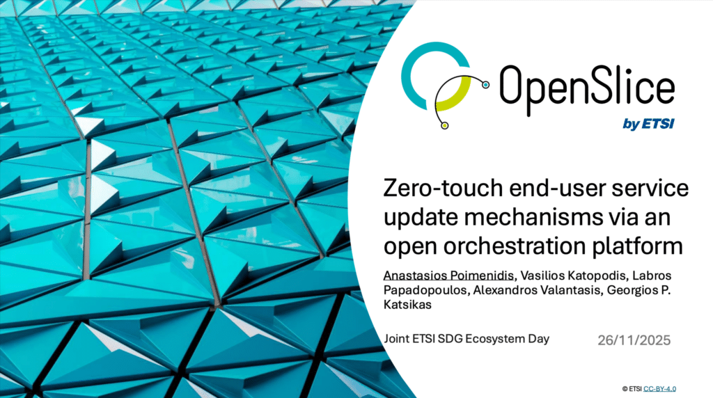 Next, the presenter introduced three service runtime update scenarios, each covering different runtime aspects. Before demonstrating these scenarios, the presenter explained the setup of the demonstration, which consists of two orchestration platforms, i.e., Maestro and OpenSlice, that belong to the ETSI OpenSlice Software Development Group (SDG) as well as an open cloud orchestration platform by RedHat titled Open Cluster Management (OCM). A short demonstration of this setup was provided, showing the service catalogs of the two orchestrators along with the state of the OCM cluster, before the execution of the three main scenarios.