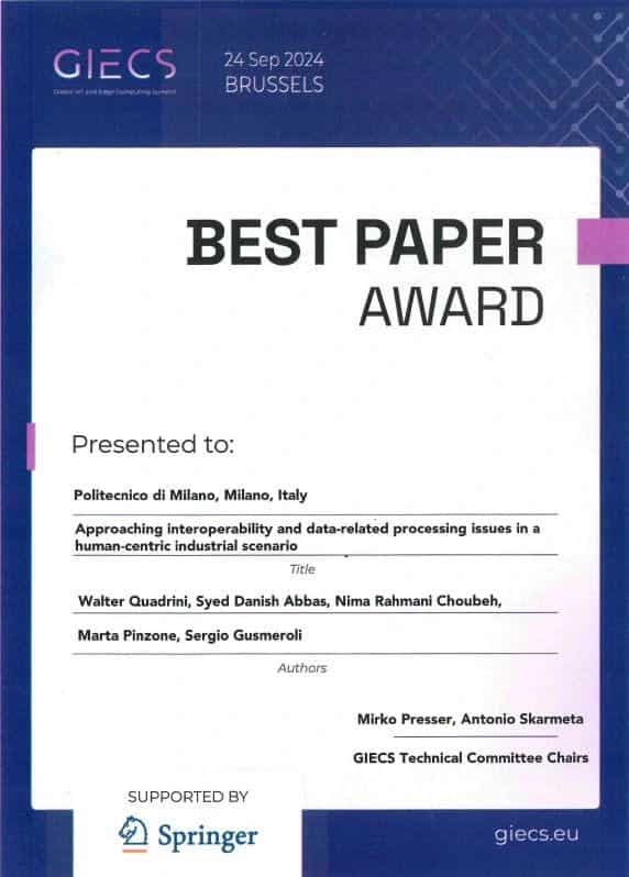 The INCODE consortium is delighted to announce that the team from consortium partner POLIMI (Politecnico di Milano) has received the Best Paper Award at the Global IoT & Edge Computing Summit (GIECS 2024) in Brussels, on September 24, 2024. This award, presented during the AIOTI Days 2024 event (September 24-25), honors their innovative work on human-centered manufacturing.